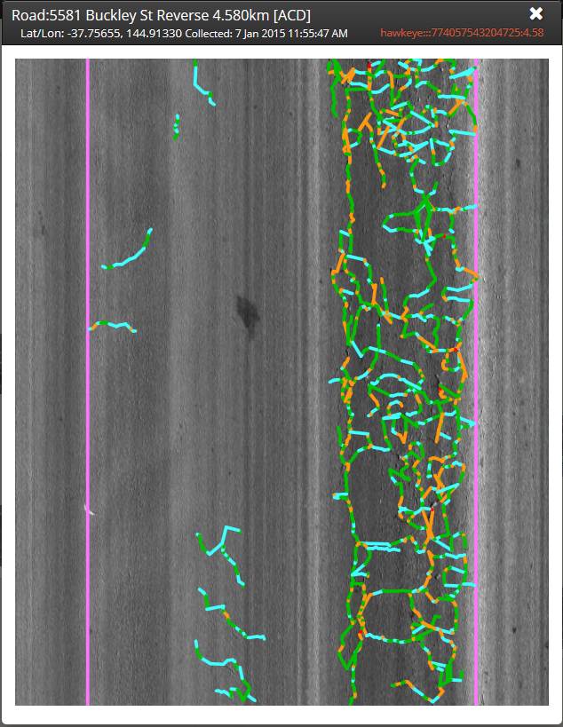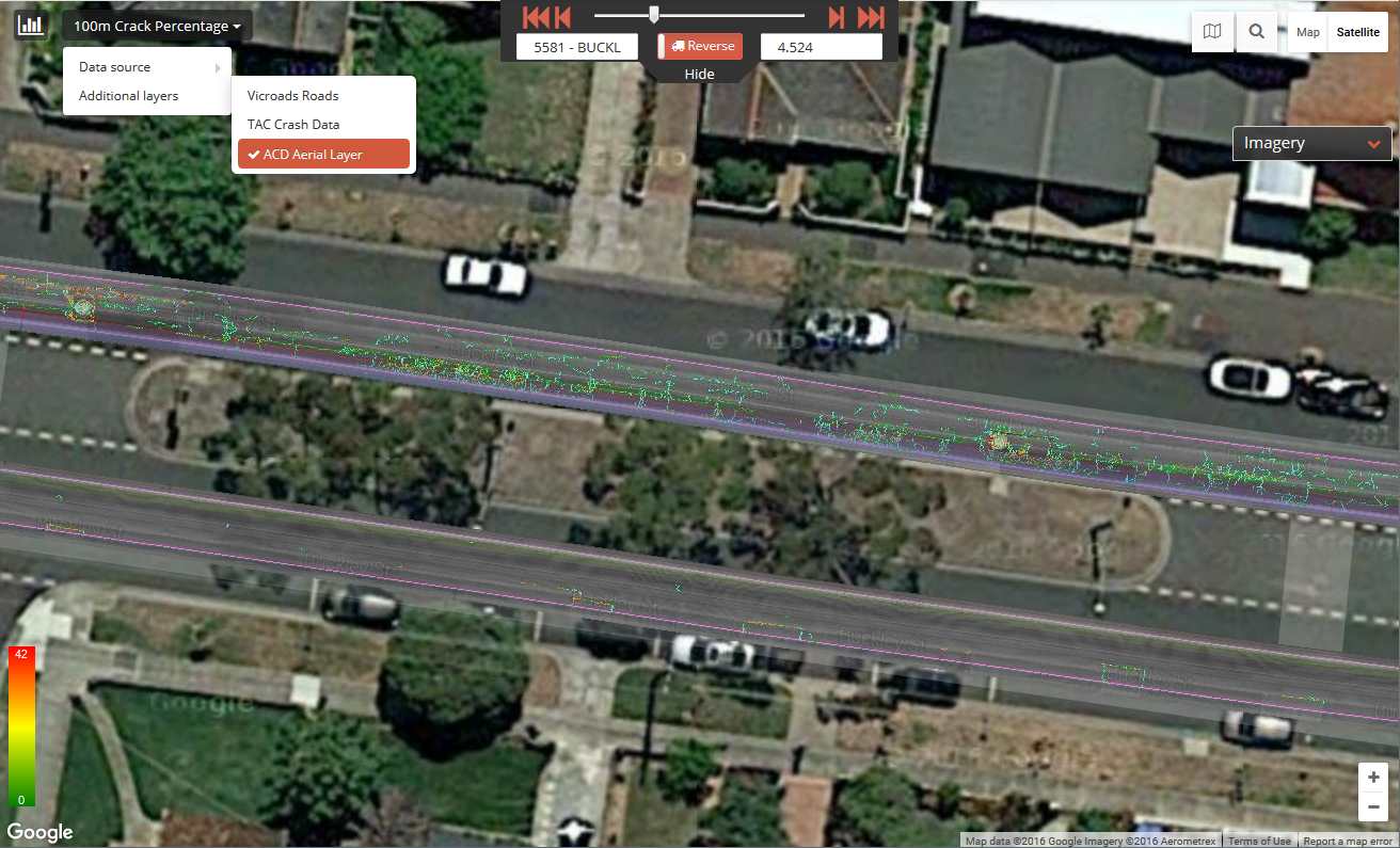 Automatic Crack Detection (ACD) data can be displayed as an overlay on Google Maps, allowing the viewing of the data collected on an entire road, at once.